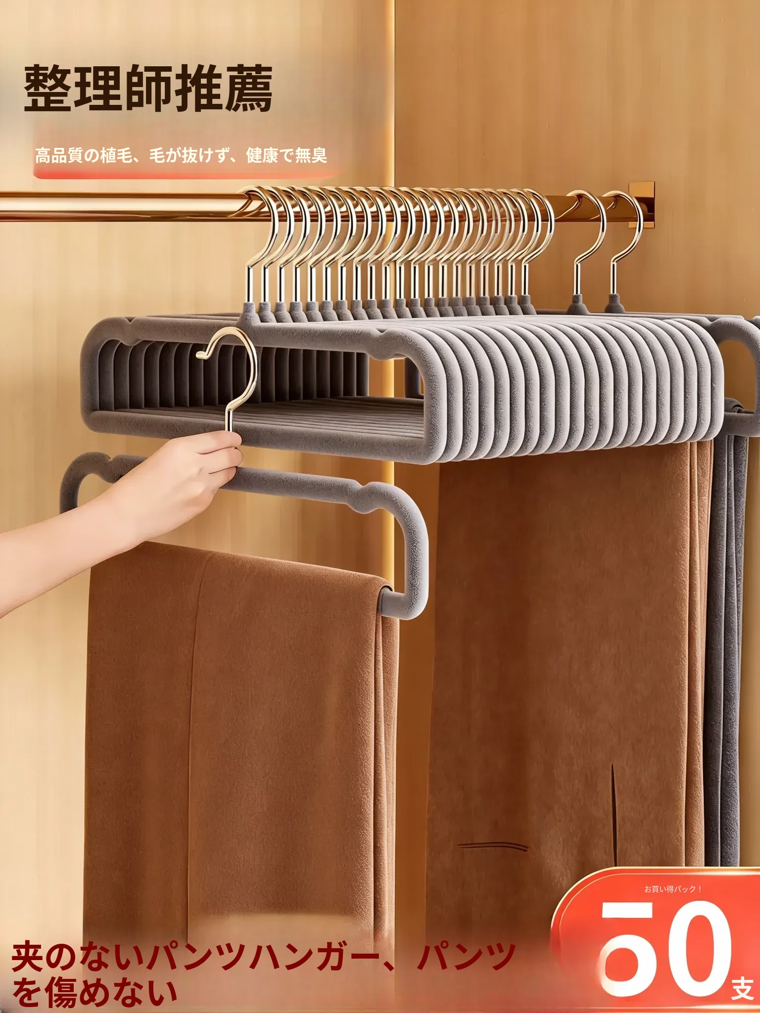 滑り止め・無痕のフロッキー衣類ハンガー - 整理整頓に最適!家族や学生寮で大活躍のパンツハンガー。衣服をしっかり支え、シワを防止。おしゃれで実用的な収納アイテム!