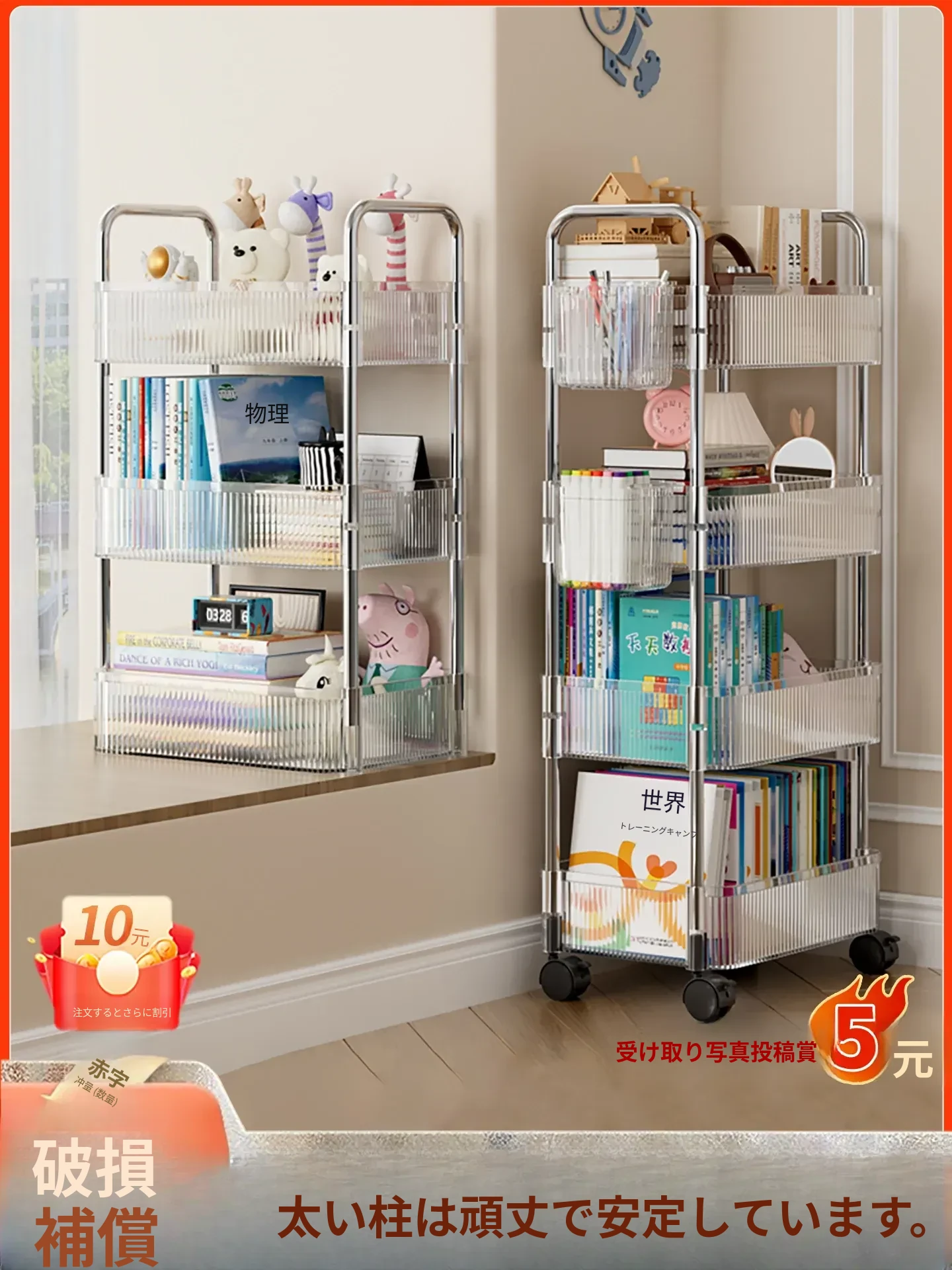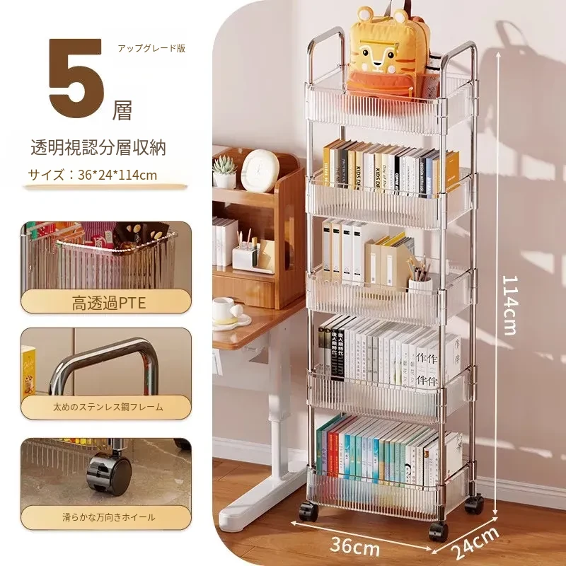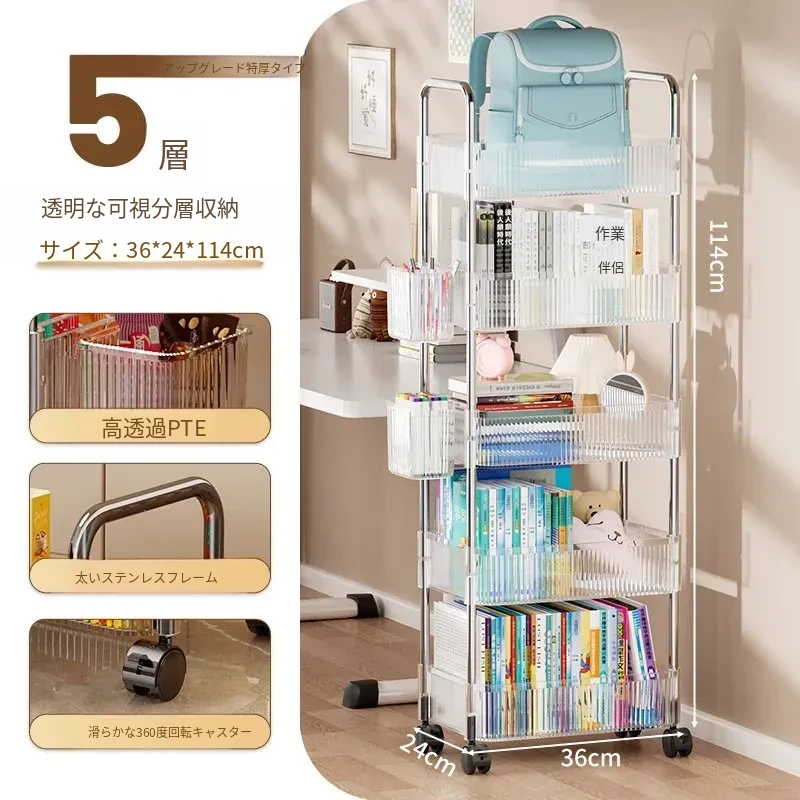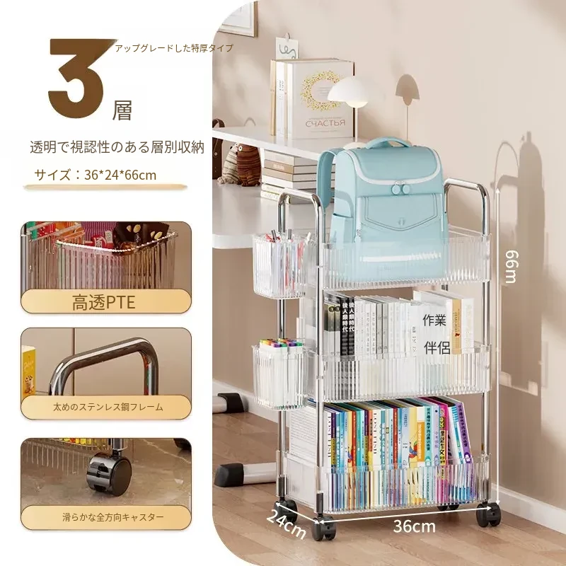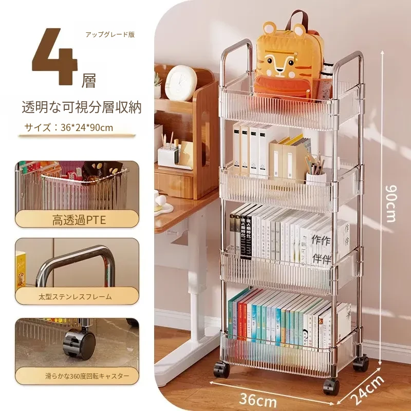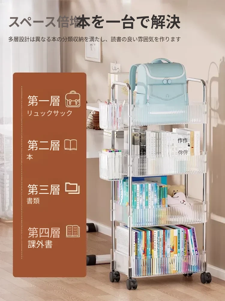 アクリル製ブックスタンド付き移動式小型ラック - 本や小物をスマートに収納!デスク下やキャビネットにぴったりの多段収納棚。家での整理整頓をお手伝いする便利アイテム!